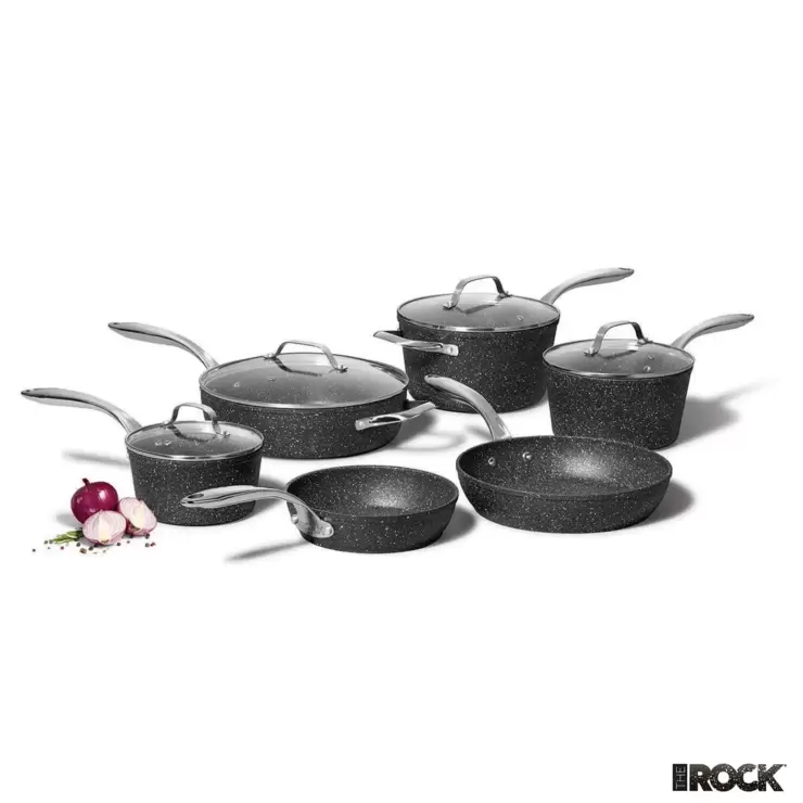 The Rock Cookware Set by Starfrit is sleek, stylish and extremely durable with patent-pending Rock.tec technology. This technology uses tiny steel pellets to harden the aluminum creating a permanent, rock-like finish with peaks and hollows on the surface of the pan. These dimples create air pockets under the food, so the food does not have a flat surface to stick on. The result is unparalleled non-stick performance. This rock-like finish is also highly scratch and abrasion-resistant. Each piece is made of extra-thick forged aluminum which will not warp and provides optimal heat distribution for even cooking. Riveted stainless steel handles stay cool to the touch and the tempered glass lids with steam vent allow you to keep an eye on what's cooking.