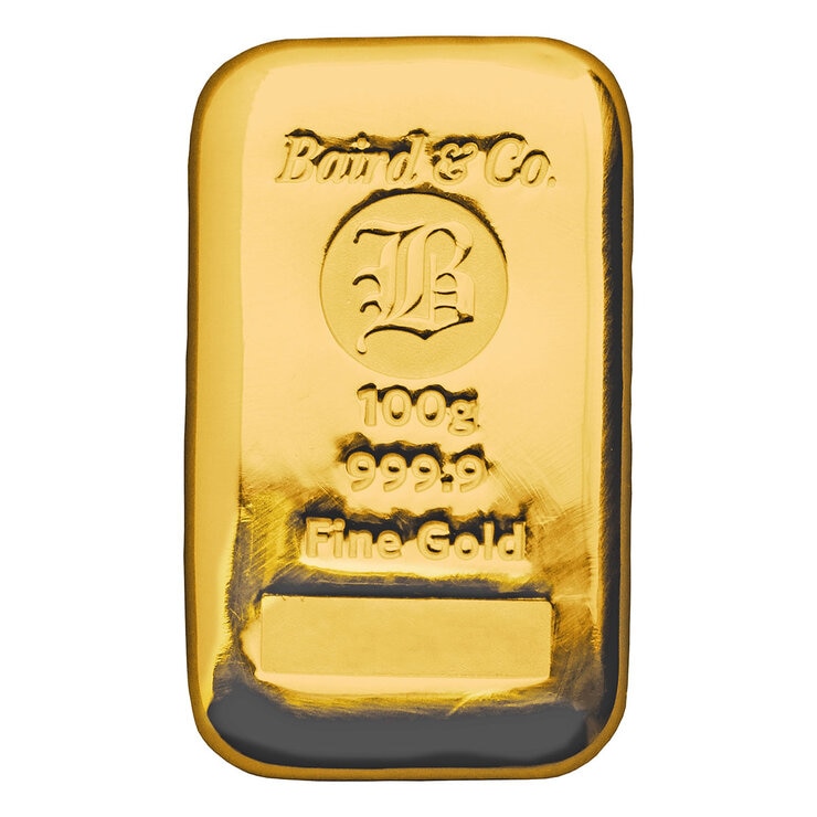 The Baird & Co. 100g gold cast bar is produced at the internationally recognised London refinery. This bar is produced to the internationally recognised 999.9 standard and carries the Baird & Co. mark, the weight, fineness and a unique serial number. Bars are supplied in clear plastic wallets.