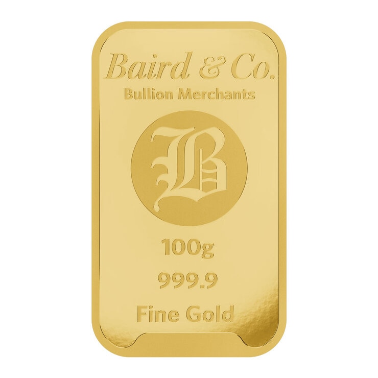 The Baird & Co. 100g gold minted bar is produced at the internationally recognised London refinery. This bar is produced to the internationally recognised 999.9 standard and carries the Baird & Co. mark, the weight, fineness and a unique serial number. Bars are supplied in sealed, tamper resistant packaging.