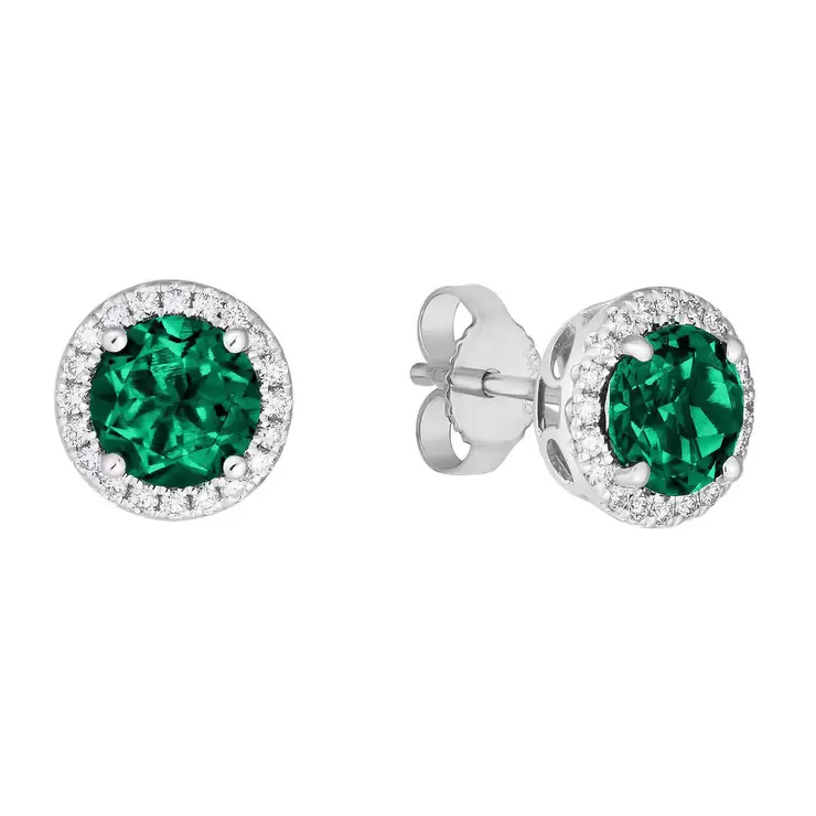 Round Cut Lab Emerald & 0.19ctw Diamond Earrings, 14ct White Gold