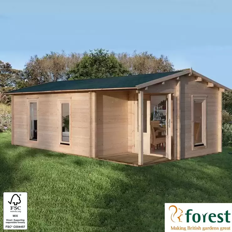 This large and spacious Forest Garden Woodbury Log Cabin is a contemporary and stylish chalet-inspired structure with a light and airy interior. Manufactured from high quality 58mm interlocking machined logs, it is fully double glazed throughout. The large double glazed double door has a mortice lock for added peace of mind and opens out on to the porch area which is ideal for additional seating or storage space.