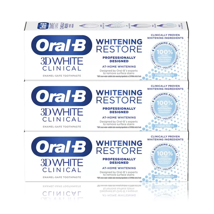 Oral-B 3D White Clinical Whitening Restore Toothpaste is designed by Oral-B's experts with 100% more activated whitening ingredients as it contains 100% more water-soluble stain removing ingredients versus Oral-B 3D White Arctic Fresh Toothpaste. This toothpaste removes surface stains with 4 whitening actions which loosen, lift, polish and protect teeth.