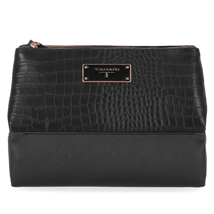 Tahari Toiletry Case is perfect for travel or everyday use. The large case has three separate roomy interior clear sections to organise all your travel and personal essentials. There are twin top zippers and magnetic closures to ensure your case is secure and compact. The two triangular zippered sections which create the pyramid shaped top are suitable for storing smaller items securely. The gorgeous design brightens up your travels and the gold and silver coloured accents add a hint of sparkle. The recycled PVC exterior with polyester trim is water resistant.