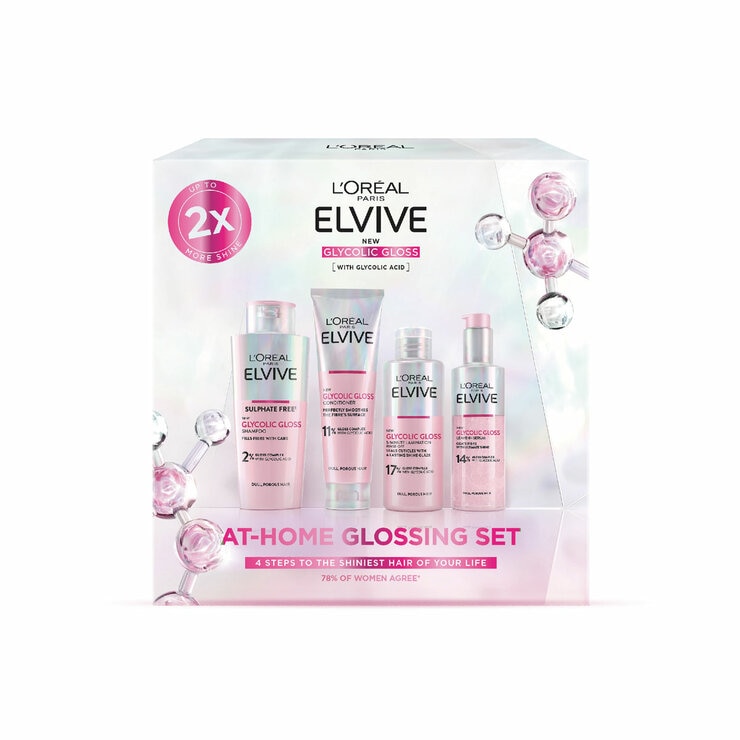 Transform lacklustre lengths with the L'Oréal Paris Elvive Glossing Routine. Created specifically with dull hair types in mind, the set visibly enhances shine, strength and softness.The four-step regime is powered by a Glycolic Gloss Complex. Starring [Glycolic Acid] and a blend of conditioning agents, the complex seals in a lustrous glaze for a shine so good you won't believe you got it at home**.