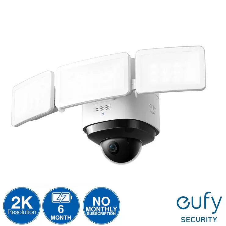 The eufy 2K Pan & Tilt Floodlight Camera features impressive full 2K HD video footage, 3,000 Lumen brightness and 360° camera coverage, making this the ultimate home security floodlight camera with the added benefit of no monthly fees.