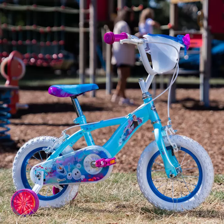 Let your little one ride in Arendelle style with this kids bike featuring their favourite characters. The Huffy Frozen Kids 12" Bike is made for beginner riders with a desire to venture into the unknown. Kids learning to balance will appreciate the wide training wheels on this bike. Kids can pedal, cruise, and stop easily with easy-to-use brakes. With 12" knobby tyres, a steel frame, and padded seat - this kids bike goes anywhere your kid can go. Made for little kids who love Frozen and love to ride, this bike is recommended for kids ages 3 to 5 years old. Suitable for children 98-112cm in height, you can adjust the seat height to fit your growing child.