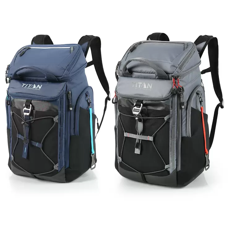 The Titan Deep Freeze® 26 Can Backpack Cooler keeps ice up to 2 days and has 5 insulated compartments, 7 accessory pockets and 2 removable Ice Walls®. Fitted with a 26 can capacity main compartment and features SuperFoam® insulation with Therma-Flect® radiant barrier and an Ultra Safe® leak proof protective lining, making this perfect for camping or trekking. Reduce wasting time and difficulty cleaning with the easy clean lining. All 5 insulated compartments as well as the Ice Wall® pockets have Microban® to help protect against bacterial odours and stains. The exterior front and sides are constructed of stain and water resistant, easy clean material. The back is comfortable with padded and breathable mesh panels; adjustable, padded backpack straps; and sternum strap. Also with a removable bottle opener, the Titan Deep Freeze 26 Can Backpack Cooler is perfect for picnics, beaches, hikes and country trips.