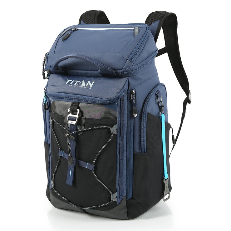 The Titan Deep Freeze® 26 Can Backpack Cooler keeps ice up to 2 days and has 5 insulated compartments, 7 accessory pockets and 2 removable Ice Walls®. Fitted with a 26 can capacity main compartment and features SuperFoam® insulation with Therma-Flect® radiant barrier and an Ultra Safe® leak proof, making this perfect for camping or trekking. Reduce wasting time and difficulty cleaning with the easy clean lining. All 5 insulated compartments as well as the Ice Wall® pockets have Microban® to help protect against bacterial odors and stains. The exterior front and sides are constructed of stain and water resistant, easy clean material. The back is comfortable with the padded and breathable mesh panels; adjustable, padded backpack straps; and sternum strap. Also with a removable bottle opener, the Titan Deep Freeze 26 Can Backpack Cooler is perfect for picnics, beaches, hikes and country trips.