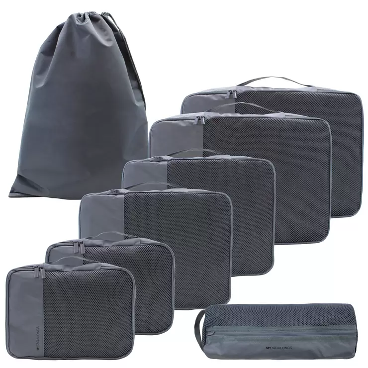 Take away the stress from your pre holiday packing and have your case organised in no time! MYTAGALONGS Packing Cubes can do just that. These handy cubes allow you to organise your case in the perfect way and helps optimise space. No more cramming clothes in, simply fold and place inside the zipped packing cube. This 8-piece set comes in an array of different size and shaped organisers giving you endless options when packing. Crafted from premium recycled nylon and a mesh top to provide supreme breathability. Designed with reinforced seams and sturdy handles, these cubes are built to withstand the rigors of travel while helping you maximise luggage space and minimise wrinkles.