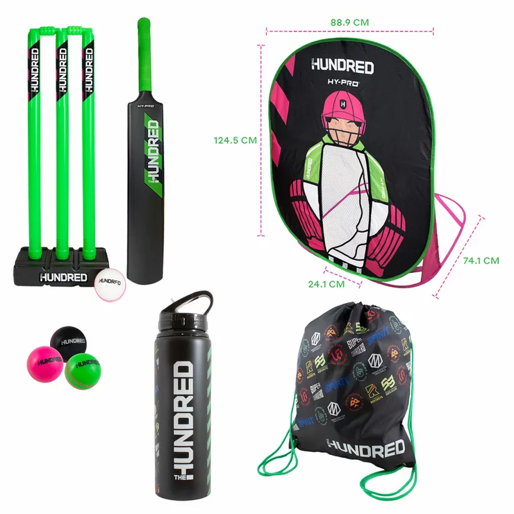 • The Hundred Midi-Size 3 Cricket Set: Includes a medium-sized bat and stumps sized for junior and recreational play, perfect for garden cricket sessions and beginner skill development.