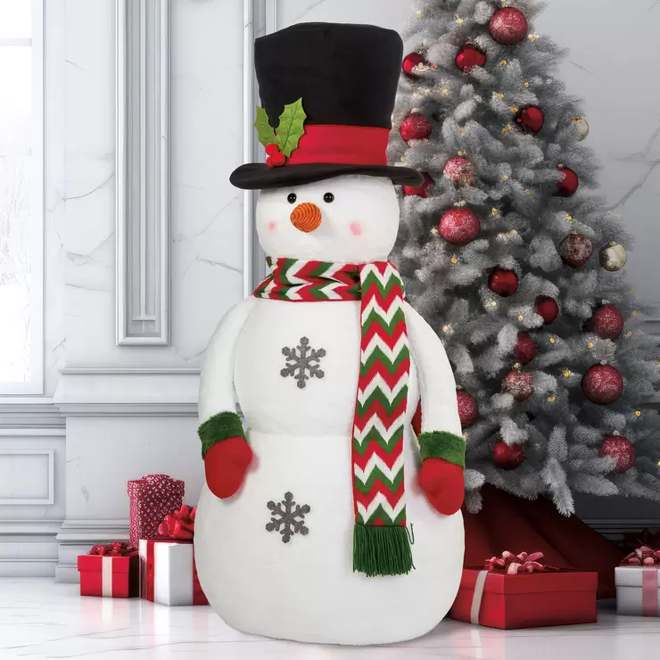 Bring the magic of winter into your home with our 3.9ft / 48-inch tall soft sculpture snowman! This oversized snowman comes in two charming styles and is the perfect statement piece for your holiday décor. Whether you choose the refined elegance of the Top Hat Snowman or the whimsical charm of the Stocking Cap Snowman, both styles are crafted to create joyful memories and spread holiday cheer. These oversized snowmen also make the perfect photo opportunity at any holiday party or event. Bring holiday cheer into your home with this beautiful statement piece. Don’t miss out on the chance to enhance your holiday décor and celebrations with these adorable snowmen!