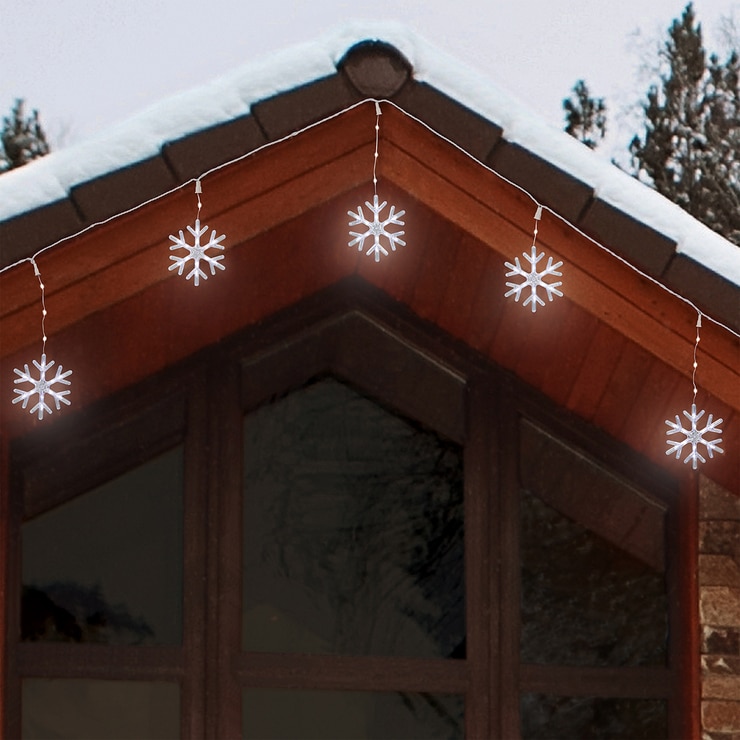 Add a unique look to your holiday display with these LED snowflake icicles that have 8 different lighting effects to choose from. With the special synchronising feature – you can connect up to 3 sets of these snowflake icicles and all will display the lighting effect you have chosen! With 16 snowflakes and 224 cool white LEDs, this string light can be used both indoors and outdoors.