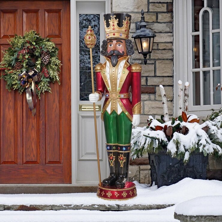 Standing at attention this magnificent 6ft tall musical nutcracker will serve as a friendly guardian to your home, wowing guests and passers by. Featuring 8 different Holiday songs, music will fill the air while 25 LED lights illuminate this artfully sculpted, fully dimensional figure. Hand painted with rich, glossy colours and glitter accents, this impressive nutcracker is sure to be the center of attention in any home.