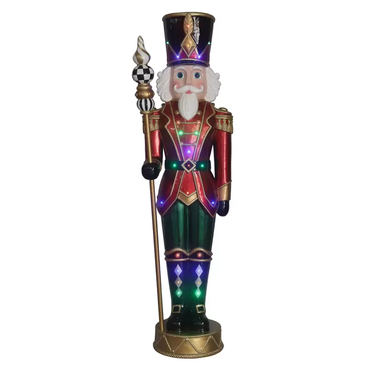 Behold, a guard of festive cheer! Standing tall at six feet, this grand Nutcracker, crafted from weatherproof resin, is ready to guard your home with twinkling magic. His hand-painted form, adorned with 25 dancing LEDs, reflects the warm glow of the season, while eight classic carols fill the air with enchanting melodies. Imagine snow-kissed nights illuminated by his festive spirit, transforming your indoor or covered outdoor space into a winter wonderland brimming with joy. Let this magnificent guardian usher in a season of cherished memories, bathed in the warm embrace of holiday cheer