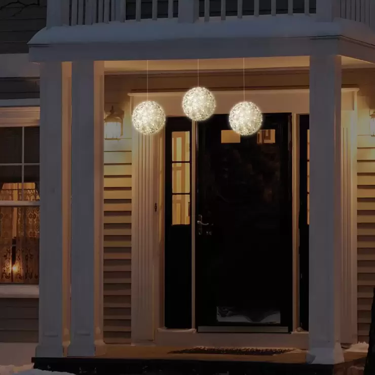 Accent your space this Christmas with this stunning set of three Super Bright White LED Lighted Spheres. Decorate your indoor tree, create an elegant table or mantle decoration or hang from your outdoor trees or bushes. Each of the three elegant spheres are crafted from white wire and have 50 warm white LED lights to create a real ambience wherever you choose to arrange them. Spheres are strung together as a set with 61 cm spacing between each sphere and a lead wire length of 182.8 cm.