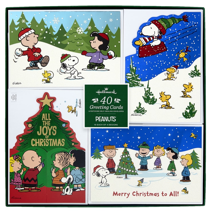 Each box of Christmas cards with foil and glitter accents includes 10 cards each of 4 designs: Charlie Brown and Lucy throwing snowballs, Snoopy and Woodstock flying down a snowy hill, a green tree with "All the Joys of Christmas", and a gathering of Peanuts characters with "Merry Christmas to All".
