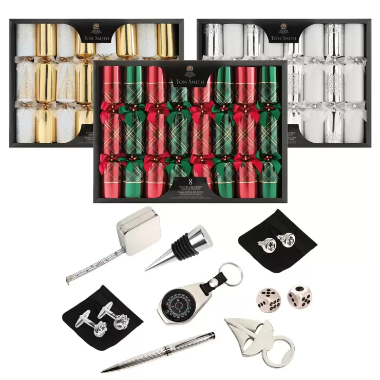 - Each cracker comes with a quality silver plated gift, foil hat, Tom Smith history scroll and a joke