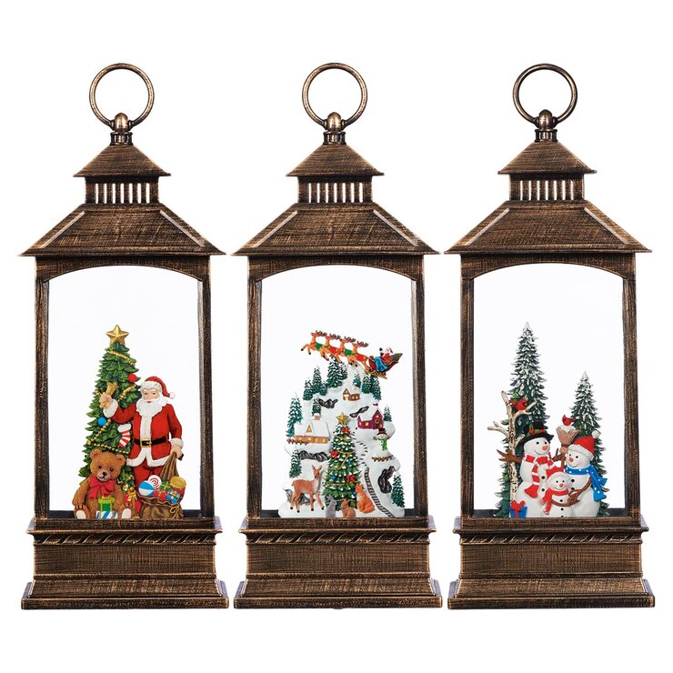 The Season's festivity and warmth shimmer within this traditional, yet elegant lantern. They feature a fun, detailed Christmas scene that is illuminated by LED lights. The swirling vivid glitter enhances the special effect. Each of the three lanterns shows a different magical Christmas scene.