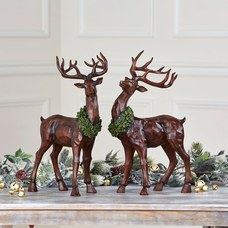 Add a touch of winter elegance to your décor this season with these 2 Wood look Standing Reindeer. Artfully sculpted in lively detail, the impressive male bucks stand tall at 48.8 cm. Every deer is beautifully carved, bringing a sophisticated style to any area they are displayed.