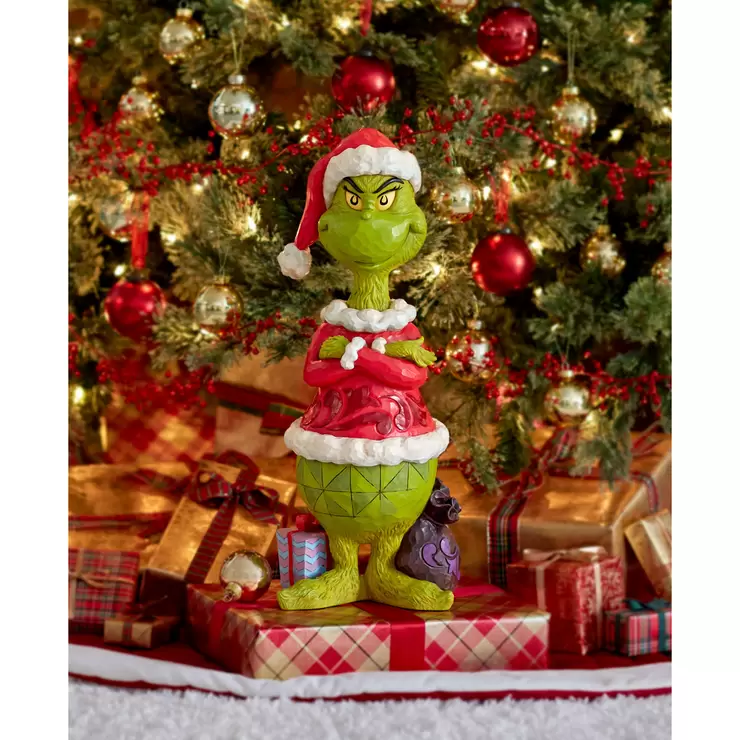 Dressed in a festive Santa top and hat with his arms crossed, the Grinch is full of holiday spirit! This eye-catching 20” hand-painted Grinch statue is meticulously designed in Jim Shore’s unique folk-art style with rosemaling and quilt patterns, perfect for decorating throughout the home or beside the tree.
