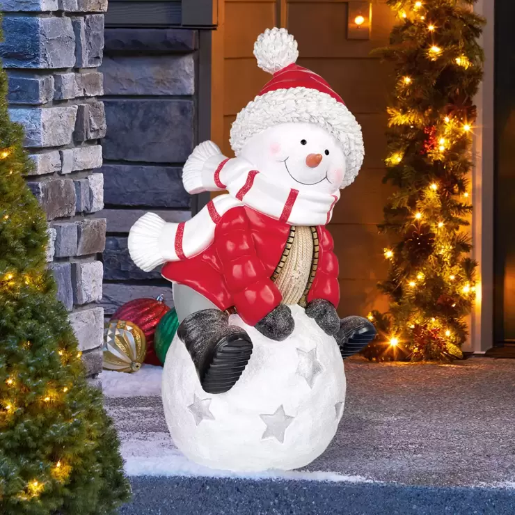 This Christmas Snowman on Snowball greater with a bright puffy red jacket and santa hat will bring cheer to adults and children alike during this festive season. Made of durable polyresin material and resistant to fading, this snowman can be placed next to your Christmas tree or outside your front door. This festive snowman on snowball greater will add festive cheer to your home, enjoy relaxing at home with this decorative seasonal piece nearby creating the ultimate frosty feel or place outside to let your neighbours and loved ones know santa is welcome in the neighbourhood. This Christmas snowman is a fun essential this season to decorate your outdoor or indoor space with a snowy feel. No assembly is required and this snowman can be moved easily making it great for storing and keeping for years to come.
