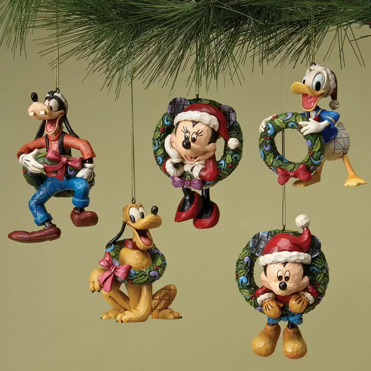Celebrate Christmas in style with Disney’s Fab 5. This Disney Traditions ornament set features Goofy, Pluto, Donald Duck, Minnie Mouse and Mickey Mouse spreading Christmas spirit as they deck the halls… and themselves… with festive Christmas wreaths. Handcrafted in Jim Shore’s meticulously detailed quilt patterns and rosemaling designs, this 5-piece ornament set is sure to steal the spotlight on your Christmas tree.