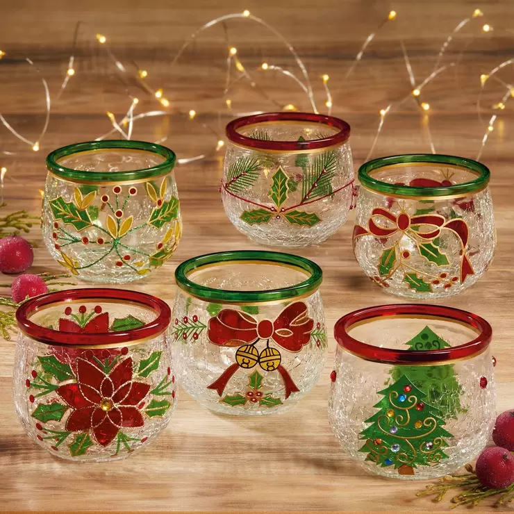 Set any décor aglow with these hand-crafted, glass tealight candle holders. Designs include Christmas Trees, holly, bows and bells, making the perfect festive addition to your home this season. The holders are both hand crafted and hand painted for a detailed, high quality finish.