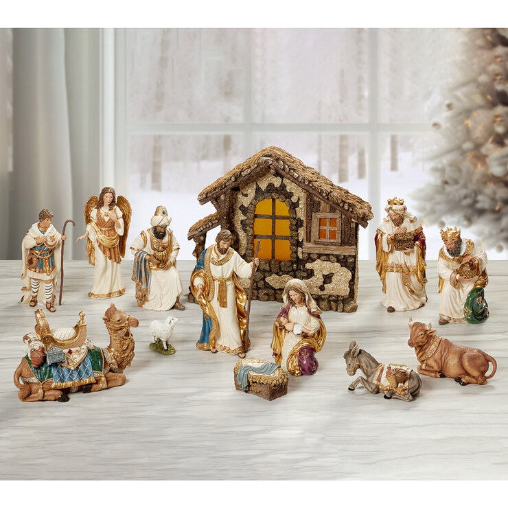 Celebrate the miracle of Jesus’s birth with this beautifully hand-painted 14-piece Kirkland Signature Nativity set. Crafted from durable polyresin and stone powder, each finely detailed figure features elegant jewel-toned finishes and expressive sculpting. The separate manger and Baby Jesus allow for customizable display, making this set perfect for indoor decorative use.