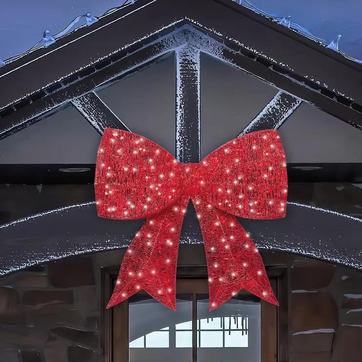 Add a traditional feel to your Christmas decor with this festive red bow. At almost a metre wide and illuminated with 200 red LED lights, this giant bow will light up your outdoor or indoor space and is sure to catch everyone's attention wherever you decide to hang it up this Christmas. It also comes with a hanging loop attached to the back of the bow, making hanging up the giant bow easy.