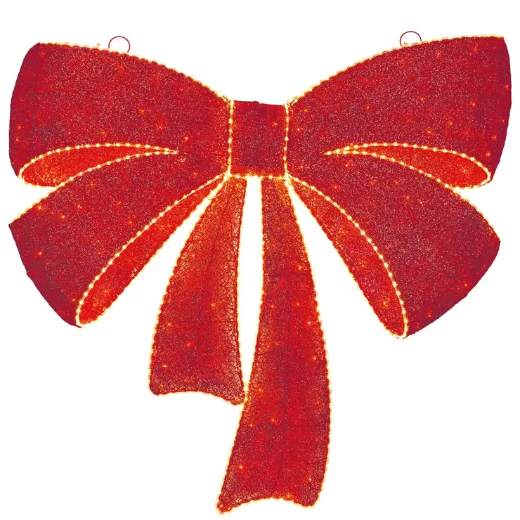 Brighten your holiday décor with this striking 48-inch Glitter Mesh Bow, featuring warm white chasing lights and steady red LEDs for a captivating festive glow. Designed for both indoor and outdoor use, it comes with two sturdy 2-inch hanging loops for easy installation. Crafted with durable materials and a long 8-meter cord, this bow ensures effortless setup and lasting holiday cheer.
