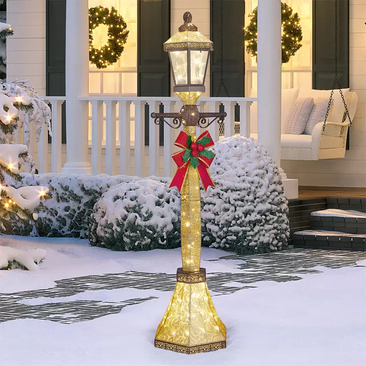 This beautiful lamp post shines and sparkles with 120 Warm LED lights, wrapped with glittery gold weather resistant fabric and bronze metal trims. A large festive bow with holly leaves creates the perfect accent. Easy to integrate into any festive decor, this lamp post can be placed outdoors to invoke feelings of a classical Christmas or indoors to brighten a room with festive cheer.