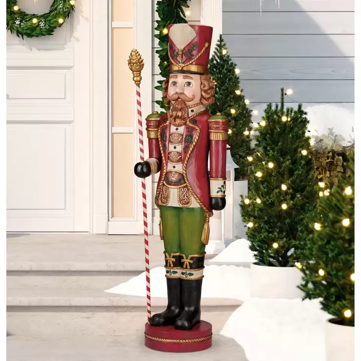 Traditional in styling, molded to look like hand carved wood with a removable staff in hand that is adorned with a beautiful pinecone finial on top gives realistic appeal. With the old world charm and exquisite attention to detail, this 6ft Nutcracker will bring warmth and joy to the season.
