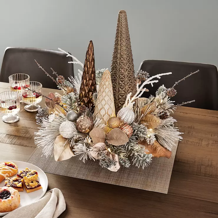 Red: This 19.5” (49 cm) pre-lit decorated centrepiece is a festive addition to any home. Embossed ceramic cone trees feature in classic holiday tones. The wood-look bowl is filled with faux cedar, pine, and gold-tipped bristle pine. Natural pinecones, faux red berries, eucalyptus, magnolia leaves and faceted ornaments complete the look. Pre-lit by 35 micro-LED lights and operating on a timer, this arrangement brings a holiday glow to any location in your home.