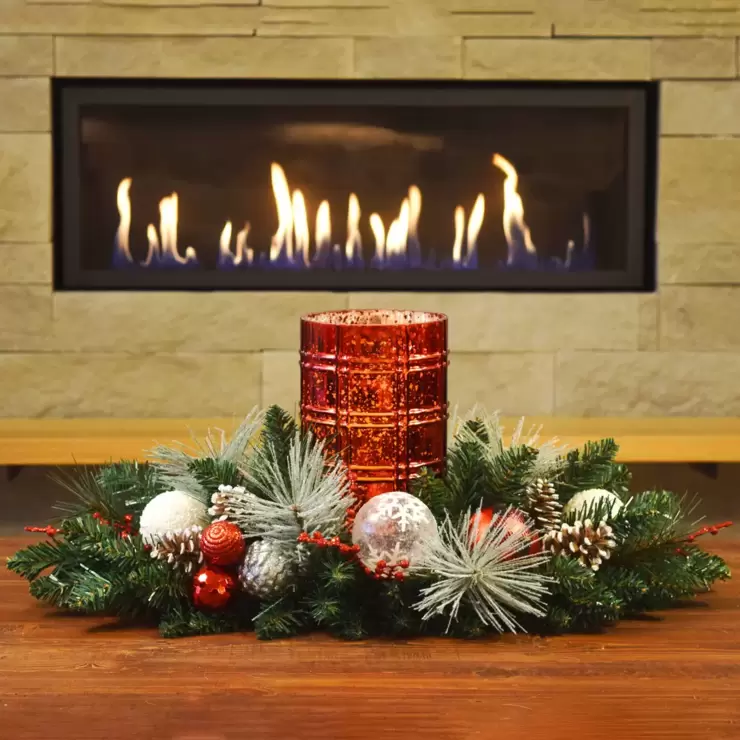 This decorated centrepiece signals it's time to celebrate and relax with it's artfully hand crafted next to nature materials, with glittering ornaments and fanciful hurricane vases. Display it on your mantle piece or make it the statement piece on your dining table to captivate guests and add a festive glow to your holiday festivities. Steeped in tradition, it combines the beauty of nature along with lustrous accents of red and gold. Add it to your wishlist to create a festive feel this season.