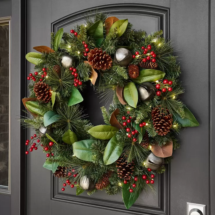 Elevate your entry with this pre-lit holiday wreath. A lush mix of faux pine is filled with flocked, faux magnolia leaves, red berries and natural pinecones. Beautiful, aged silver bells are scattered throughout and complete the look.