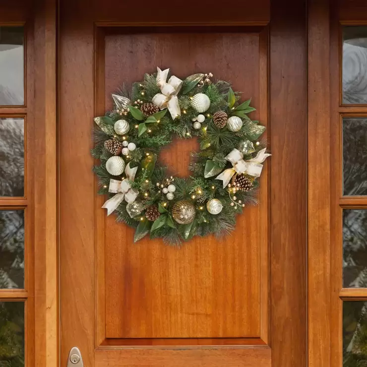 A timeless and elegant mix of magnolia leaves and champagne colored bows make this holiday wreath an instant classic. Lush faux greenery is filled with faux magnolia leaves and juniper berries brushed in gold. Faceted and textured ornaments as well as glitter-dusted pine cones add even more sophistication. Pre-lit with 50 warm white LED lights and battery-operated so that no messy cord hangs from your wreath. The batteries operate on a timer, allowing you to pre-set for 6 hours on and 18 hours off throughout the holiday season. Three “D” batteries are required (batteries not included.) Suitable for indoor and covered outdoor use.