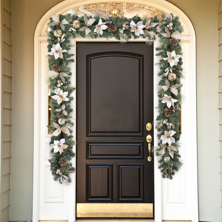 Elevate your home with this elegant garland. Multi-tone faux poinsettias are nestled in faux fir and gold-tipped bristle pine. Silver-dipped pinecones and a variety of decorative ornaments add dimension. Gold leaves, berries, and elegant plaid and mesh ribbon complete the look. Pre-lit with 90 warm white LED lights operating on a timer and battery pack, so no messy cord hangs from your garland.