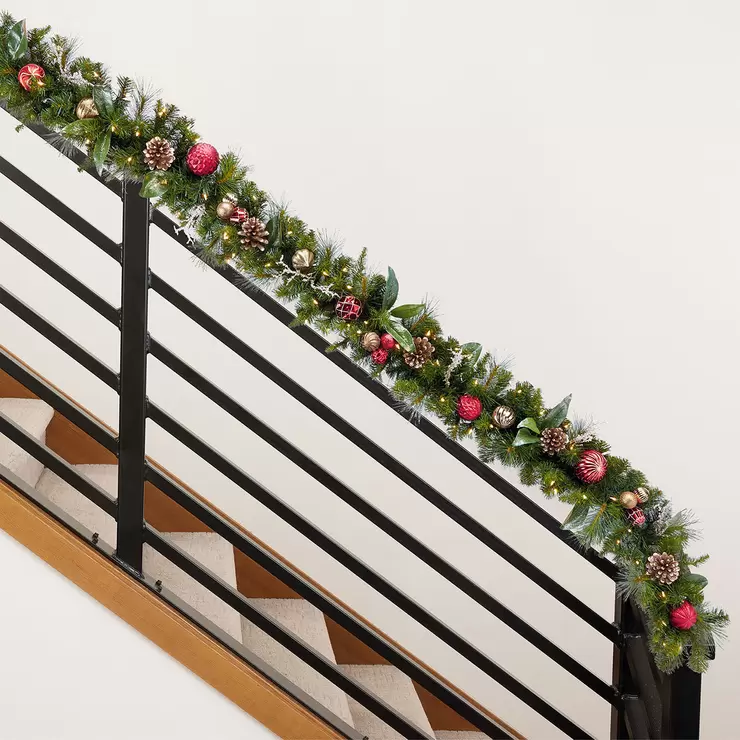 Elevate your home this festive season with this elegant garland. A lush mix of life-like, glitter-tipped pine is filled with glitter-dusted, faux magnolia leaves and champagne painted pinecones. Clusters of faceted, shatterproof ornaments in red and champagne complete the look. Pre-lit with 100 warm white LED lights and one simple cord, it will add a beautiful glow to your mantel or front garden all season long.