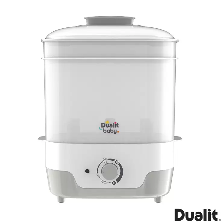 Dualit's Steam Steriliser has a six bottle capacity. A removable upper rack can be used for smaller items such as lids, teats, baby soothers and breast pump parts. Keep the lid secure and everything inside will remain sterile for up to 24 hours.