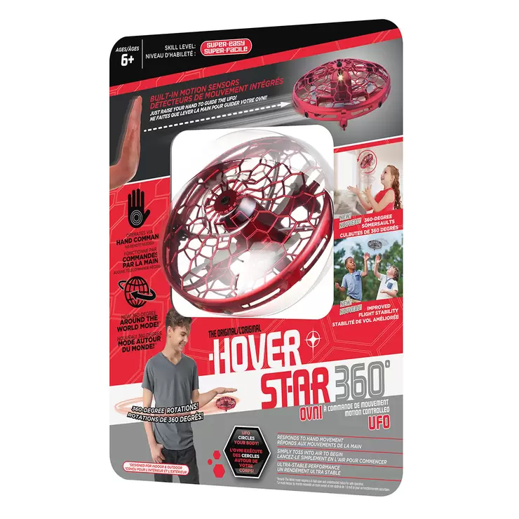 You are in control with The Original Hover Star 360 UFO. Simply toss the UFO into the air and use your hands as the control. It’s super easy and ultra-stable for ages 6 years and up. The built-in motion sensors respond easily to your hand commands and will avoid obstacles all by itself. Have fun with your friends inside or out with the durable outer shell. The Hover Star 360 also includes glowing LED lights for additional visibility in dark rooms and an auto shut-off feature for added safety.