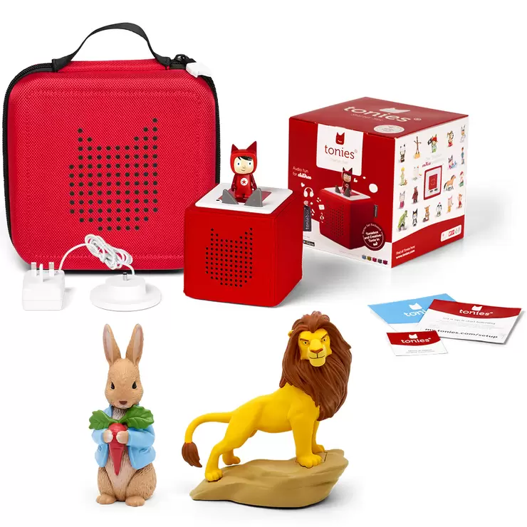 This bundle includes a Toniebox, a Creative-Tonie, a Tonie Carrier and two Tonies - The Lion King and The Peter Rabbit Collection. Your Creative-Tonie allows you to upload 90 minutes of songs, stories and more. To kick-start the adventure, their new friend comes pre-loaded with 1 hour of songs & stories. Get ready for lots of laughter, learning and fun. Toniebox and Tonies offer endless interactive listening and playing fun without bright screens, scratched CDs or complicated controls. Tonies allows children to ignite their imagination and immerse themselves in storytelling and audio adventures. Children simply place the Tonie on the Toniebox and the audio starts playing. There’s countless stories to be heard, songs to be sung and whole worlds to be explored. This Tonies bundle includes a Toniebox Starter Kit, Tonie Carrier and The Lion King and Peter Rabbit Tonies.