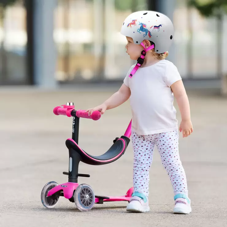 Micro Mini 2 Grow 4 in 1 Pink Scooter with Medium Unicorn Helmet and Pink Bell (12+ Months)