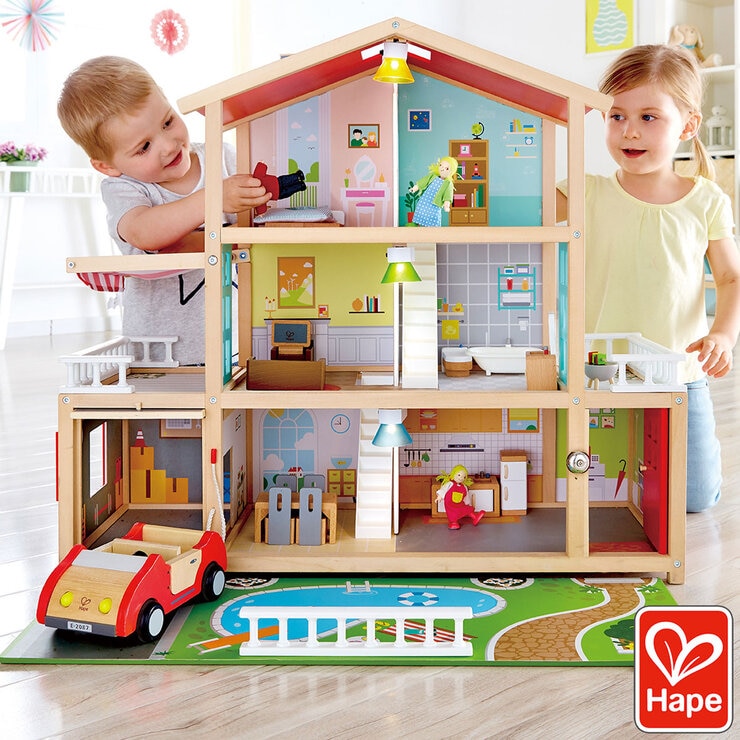 Most children dream of a doll house of their own, and this wonderful Doll Family Mansion, complete with moveable lamps and door bell, is as realistic as it gets. Make your doll family feel at home by rearranging their furniture and acting out their daily routines. This perfect playset includes a master bedroom, a children’s room, a living room, a bathroom, two balconies, a dining room, a kitchen, a hallway, a garage and a garden area with swimming pool. Let your child’s creativity flourish with a kit of seven furniture pieces and a family of four dolls. Design a pretty kitchen or a cosy bedroom for the dolls and let your imagination run free.