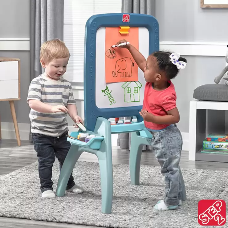 Unleash the creative genius in your kids with the sturdy, two-sided Step2 All Around Easel for Two! Together, mini Picassos can now draw and write to their heart’s content on a variety of backgrounds, including a chalkboard on one side and a magnetized dry erase board on the other, which also features a clip to hold paper in place. As any true artist will appreciate, all art supplies can be kept right within a short arm’s reach either in the spacious centre tray or in the two outer storage bins that remove for easy clean-up. Art has never been more fun!