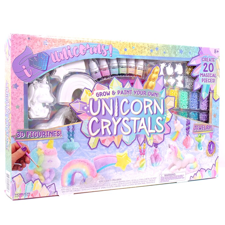 Grow your own crystals and make your world shine with the Unicorn Crystals set! Bring a little magic to any atmosphere with 4 crystal-growing figurines, like a unicorn or a rainbow — all made by you. Discover how science and style come together as you create sparkling, crystal-growing accessories. Or, learn how easy it is to transform fuzzy sticks into crystallized pendants! After your crystals have grown, make each creation completely your own — mix and match metallic paints, vibrant dyes, beads, and elastic cording! With the Unicorn Crystals set, you can explore your creativity through simple chemical reactions.