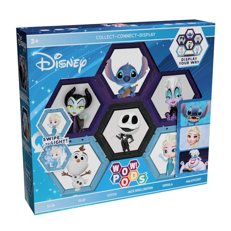 WOW! PODS connect in a number of ways so that you can make your own unique awesome light displays, of your favourite characters, across your wall, shelf, table or window ledge. Here we have a 6-pack of Disney Pods to collect! The Disney Pods collection include your favourite Disney characters Elsa, Olaf, Stitch, Jack Skellington, Ursula and Maleficent. Once the Pods are in position, move your hand in front of the POD to light it up and reveal hidden icons at the back of the WOW! POD. Light switches off automatically after 30 seconds. The perfect collectible Disney toy gift for kids, adults and fans of all ages. Boys and girls alike will love these amazing bobble head mini-figures in their hexagonal POD measuring 4 inches tall.