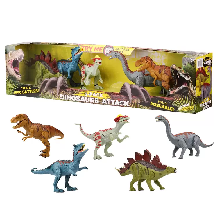 Let your imagination run wild with this 5 pack of highly detailed Poseable 9 inch (22.9cm) Dinosaurs. With your collection you can create your own epic Dinosaur battle as you play out your own story with friends! Squeeze the dinosaurs mouth for lights & sounds. Each figure is approximately 9 inches (22.9cm). Set includes Carnotaurus, Pachycephalosaurus, Stegosaurus, Argentinosaurus & Tyrannosaurus Rex.