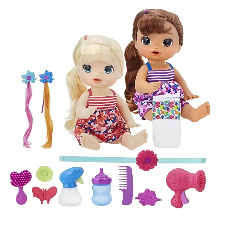 Includes doll, outfit, brush, comb, bottle, 2 diapers, 2 hair extensions, 3 hair clips, headband, spray bottle, and hair dryer accessory.