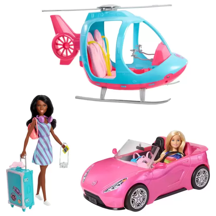 • Barbie® Gift Set with Helicopter, Convertible Car and 2 Barbie® Dolls in Fashions with Travel Accessories
