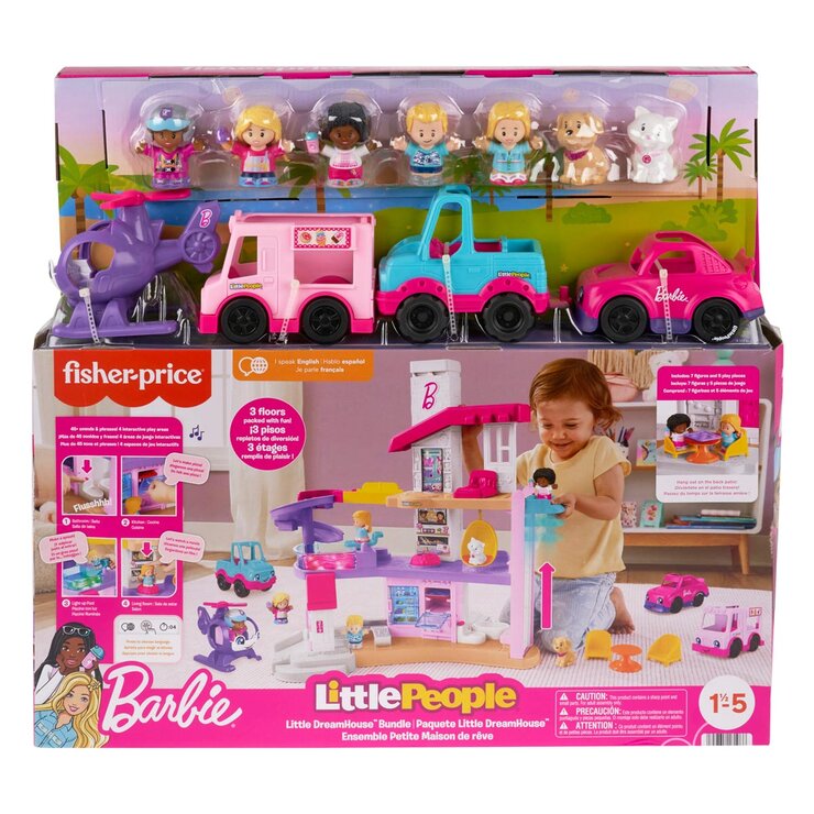 Toddlers can create their own exciting Barbie adventures with this Little People toy bundle, available exclusively at Costco. The Barbie Little DreamHouse interactive playset by Little People is loaded with hands-on fun with 3 floors of play, 5 characters and 2 pet figures, plus 4 activation points for kids to press for fun lights, music, and realistic sounds. This exclusive set includes 5 additional figures and 4 vehicles, including an ice cream truck, race car, helicopter, and pickup truck, this Little People bundle is packed with Barbie pretend play for young fans. Use the globe button to select a language: English, French or Spanish.